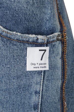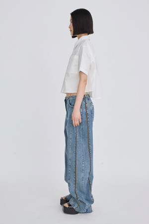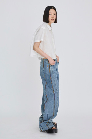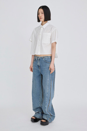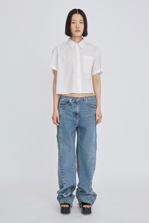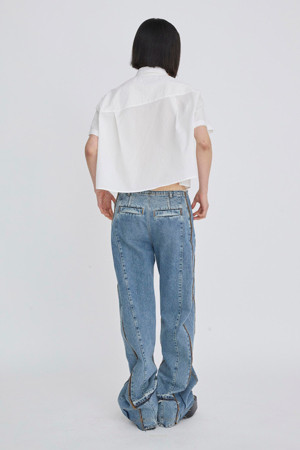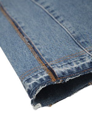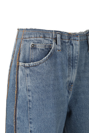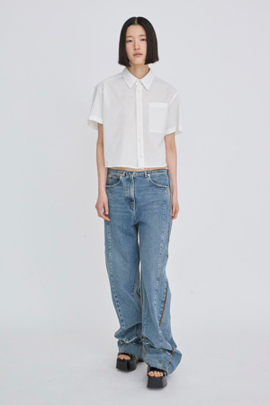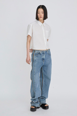 데님의 클래식한 실루엣에 변형을 더한 유니크한 스타일의 팬츠입니다.
