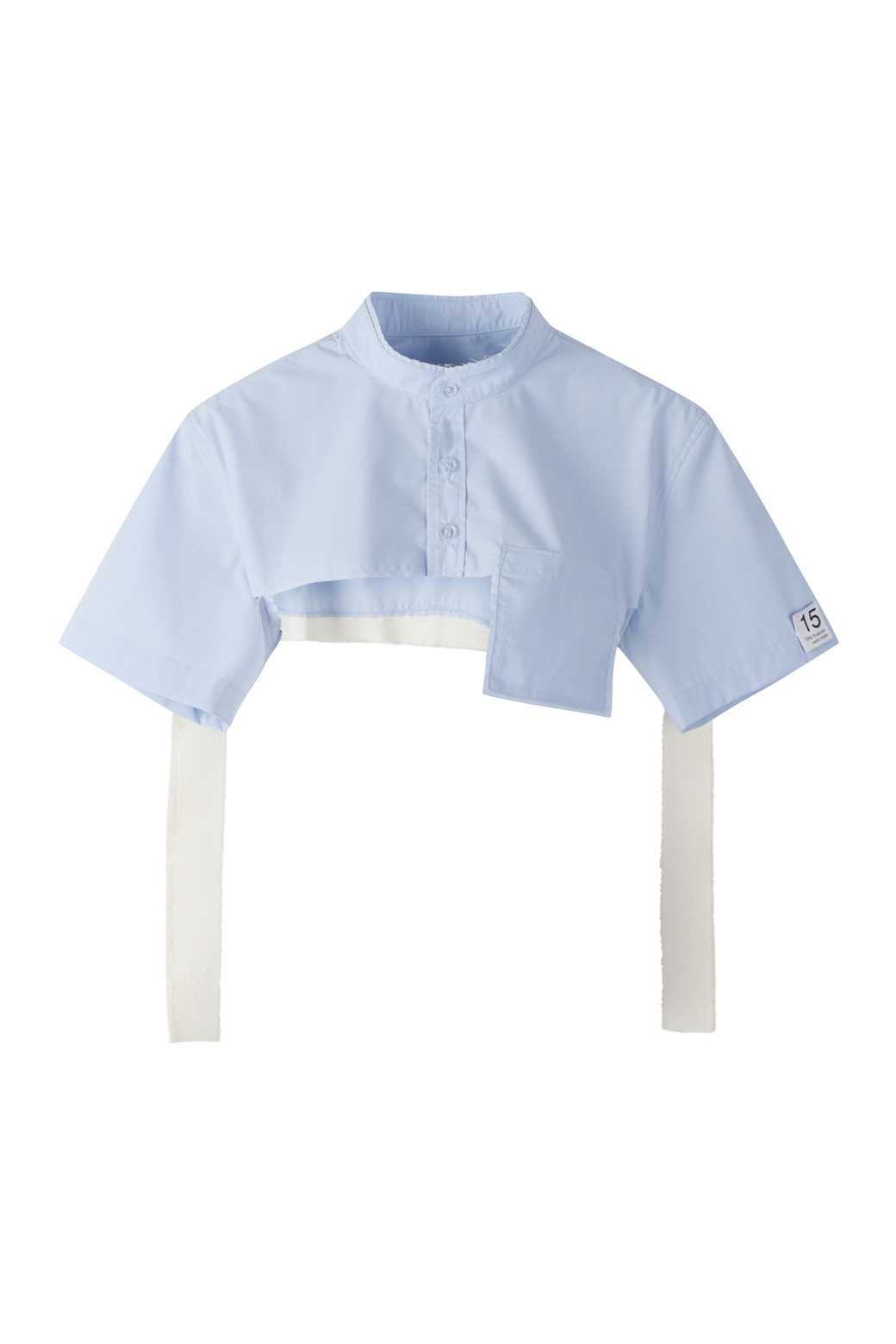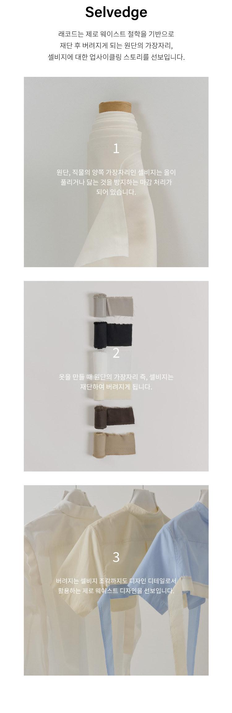 - 캐주얼 셔츠를 짧게 크롭시키는 아이디어에서 출발한 디자인으로,짧게 잘려진 기장위에 생산과정중에 버려지는 원단의